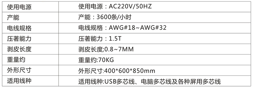 ![]() 特點說明: 連剝帶打端子壓著機,端子機,剝帶打端子機,靜音端子機, 1:剝皮打端子一次性完成,剝皮壓著同一中心控制; 2:與普通端子機同速,快而精準(zhǔn),小型輕便設(shè)計,剝線機構(gòu)調(diào)整快捷; 3:具有手動調(diào)節(jié)功能,調(diào)試方便快捷; 4:整機為靜音端子機,工作噪音小,使用安全,省電; 5:采用變頻電路板控制,具有耐用,穩(wěn)定之功能,可放心使用; 6:機械動作,調(diào)整簡易; 7:具有自動吸取廢料之裝置。 技術(shù)參數(shù): 使用電源:AC220V/50HZ 產(chǎn)能:3600條/小時 電線規(guī)格:AWG#18~AWG#32 壓著能力:1.5T 剝皮長度;0.8~7MM 重量約:70KG 外形尺寸:400*600*850mm 適用線種:USB多芯線、電腦多芯線及各種屏用多芯線